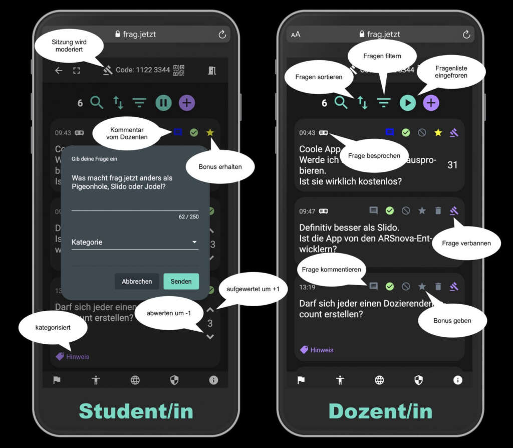 “Any questions?” In a lecture the usual reaction to this question is complete silence. Sometimes there may really be no questions. But students are often reluctant to speak up, or have forgotten what their questions were during the lecture. With frag.jetzt you can create rooms for courses where students can ask questions anonymously. In moderator mode, you as the lecturer have the opportunity to view the questions first before publishing them for all participants to see.